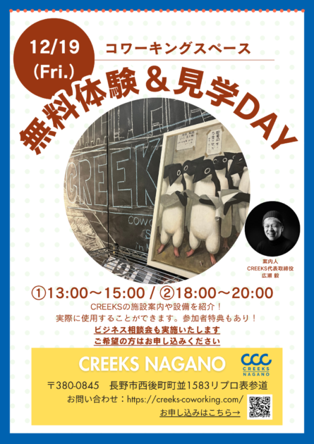 【12月2025年最後の開催!】CREEKSコワーキング無料体験&見学DAY #9