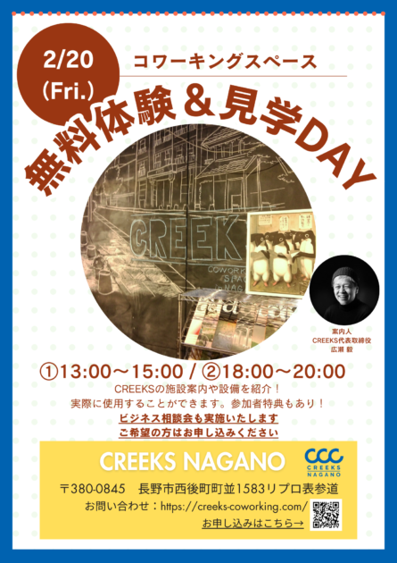 【3連休前開催!】CREEKSコワーキング無料体験&見学DAY #11